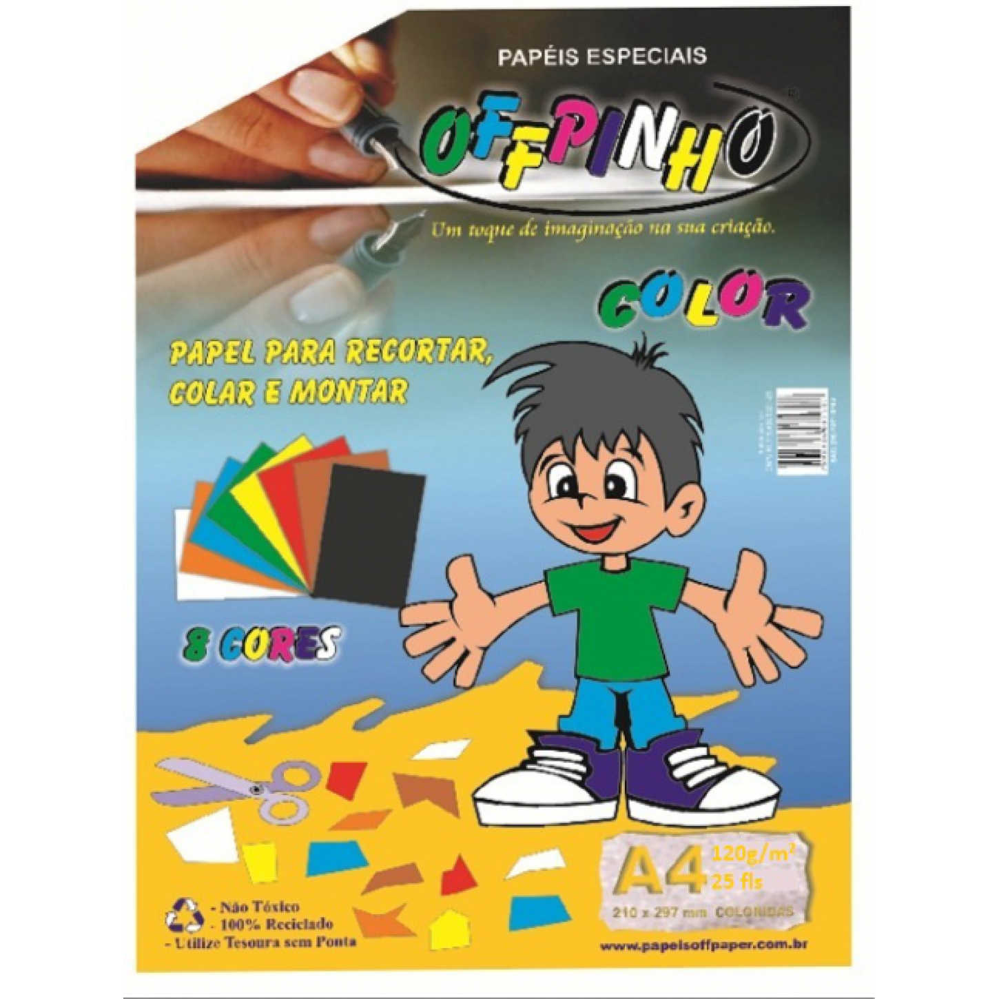Possui 25 folhas formato A4 de 120g, distribuidas em cores fortes e variadas.