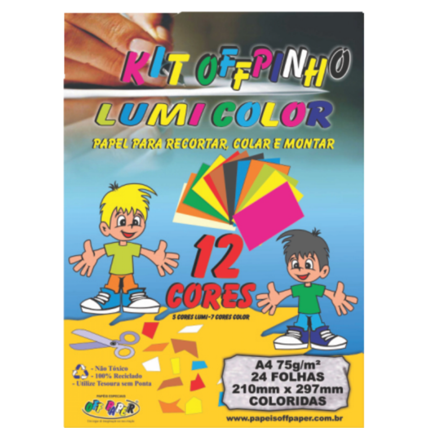 Possui 24 folhas formato A4 de 120g, distribuidas em 12 cores fortes e variadas.